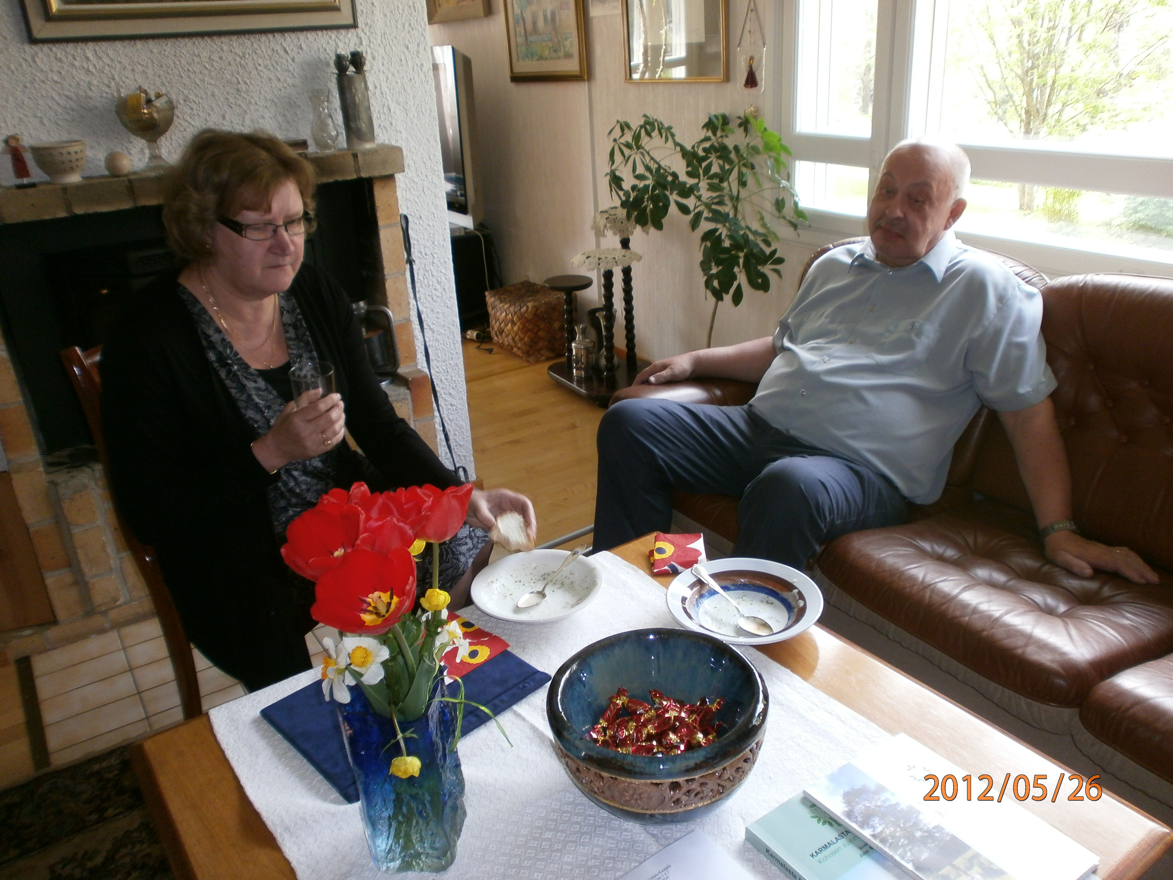Tuija ja Pekka Laitala aterioimassa olohuoneessa.