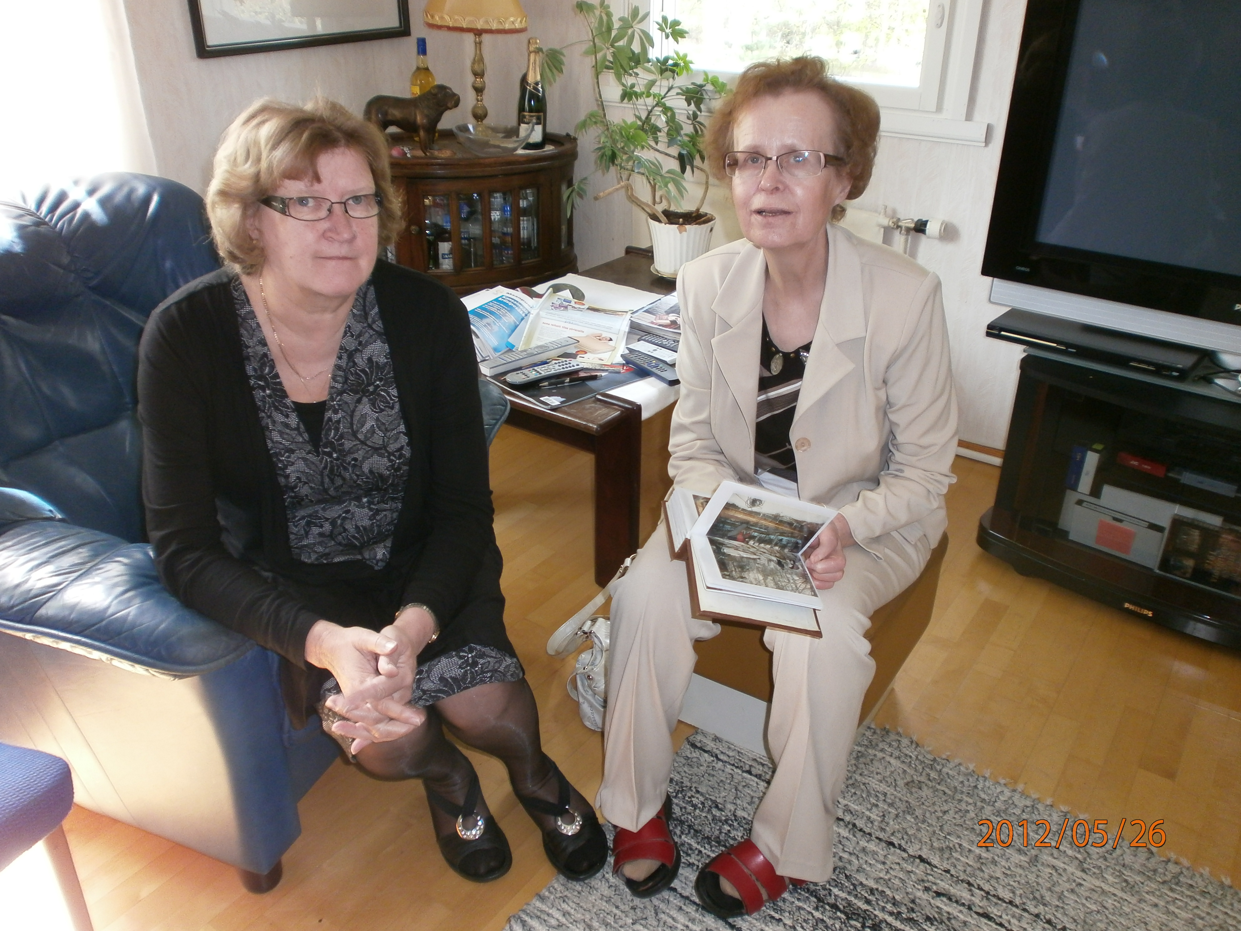 Tuija Laitala ja Eeva-Maija Mäki-Maunus jutustelemassa olohuoneessa.