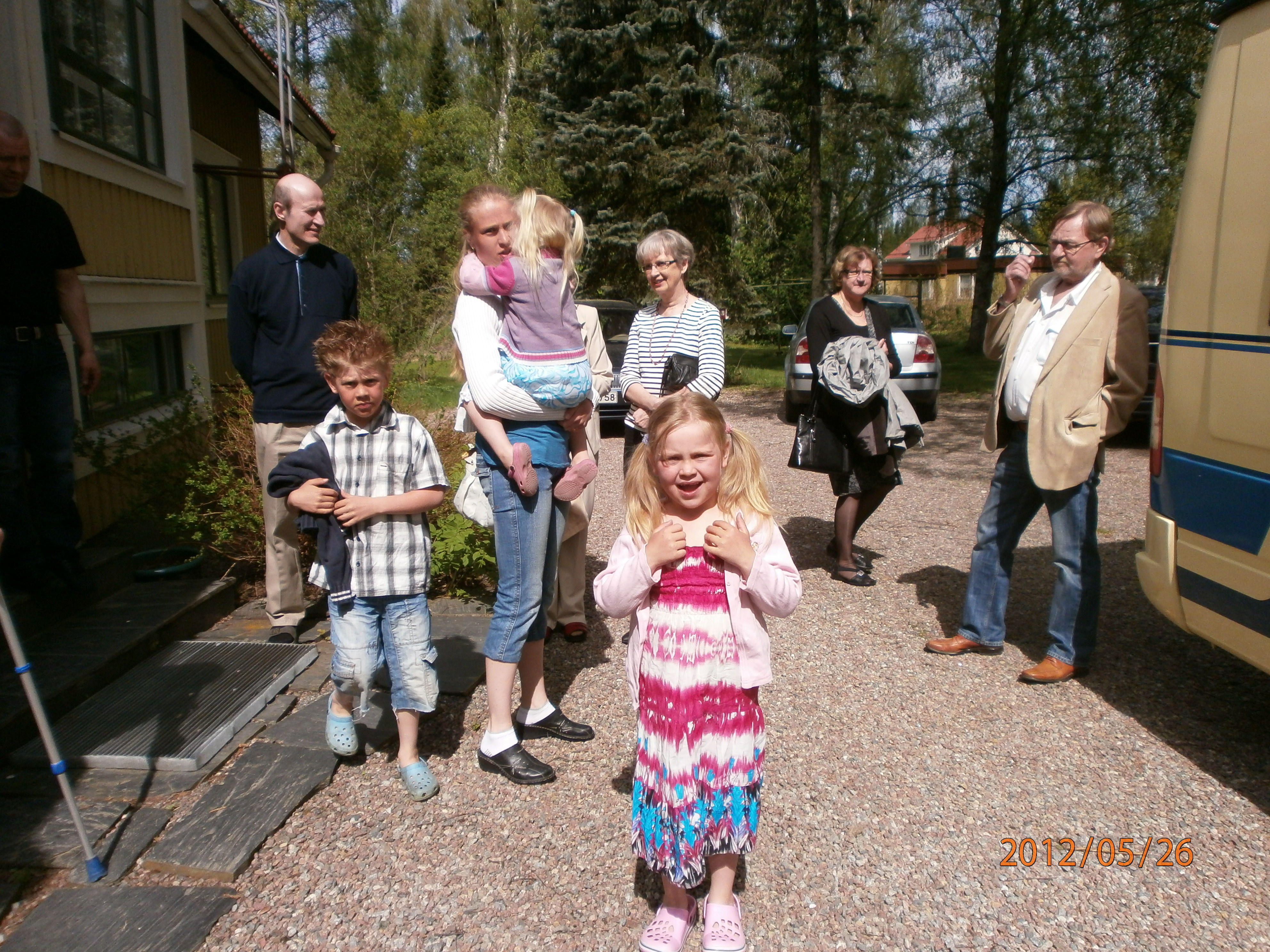Pihalla lähdössä kiertoajelulle: Oiva Mäki-Maunus, Meri Huvila lapsineen : Heikki, Laura ja Nella (sylissä),