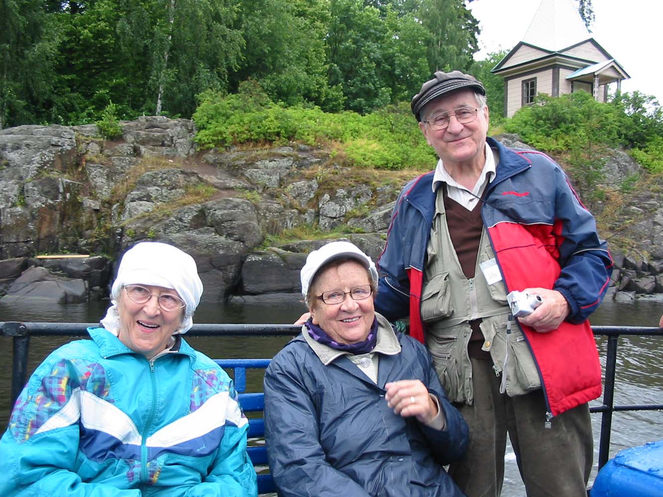 Maanantai 16.7. oli matkapäivä. Venematkat suuntautuivat Puutsaareen ja Lempisaareen. Kuvassa luostarinlahdella Aili Mattila, Kaija Kangasmaa ja Niilo Kohonen.